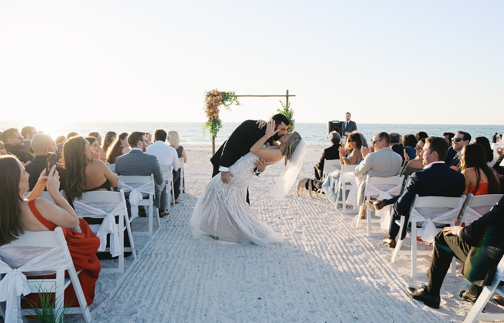 Bridget and Evan chose Pass-a-Grille Beach in St. Pete Beach, Florida for their ceremony, working with a local beach ceremony team to create a clean, romantic coastal setup.