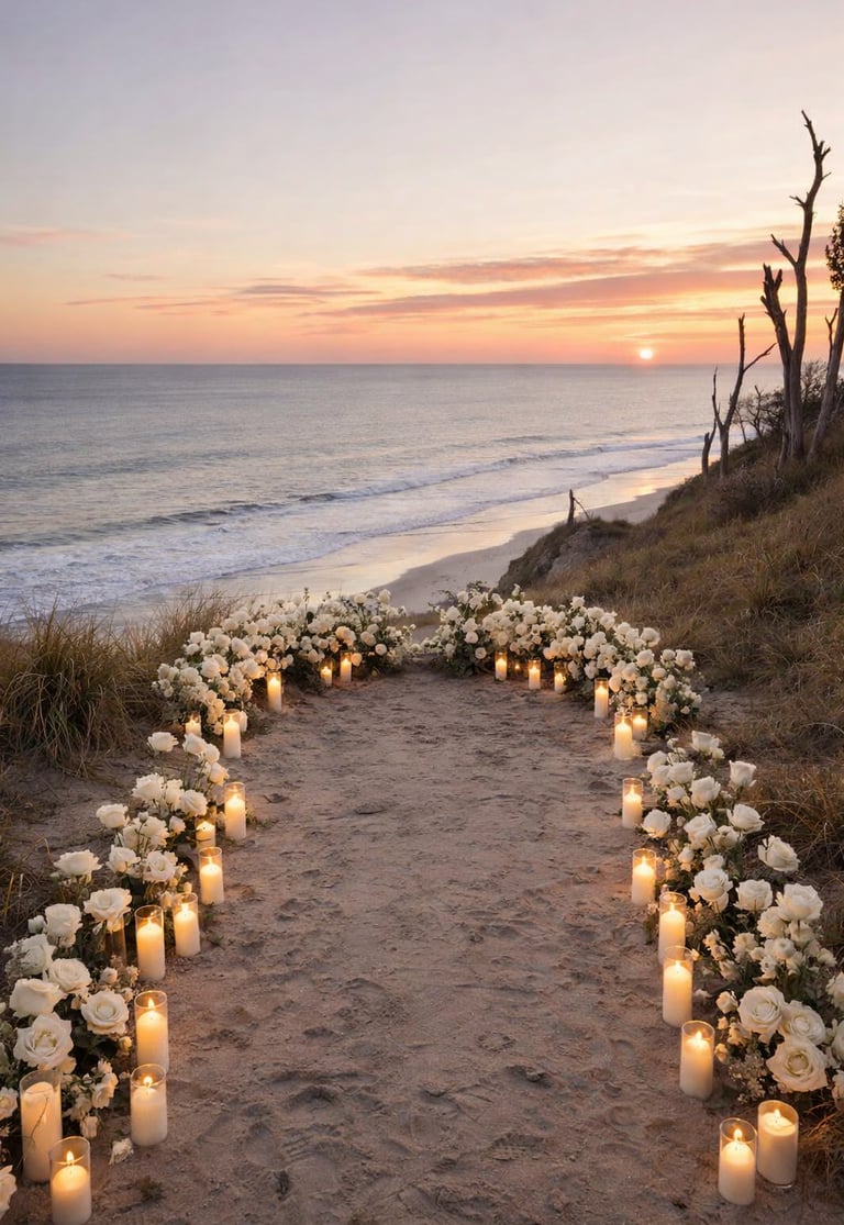Coastal minimal. Imagine a semi-circle of Ivory roses framing the moment you say "Yes", a neutral picnic blanket, picnic basket, candles, decor, and comfortable mis-matched pillows to snuggle. All designed for a romantic vibe that enhances the already beautiful ambiance.